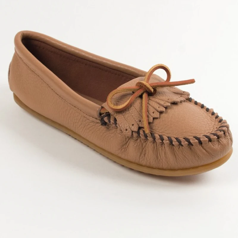 Our popular Kilty moc gets a luxe, deerskin makeover. Durable high-quality deerskin gives this moccasin its super-soft feel. Its sporty, flexible rubber sole moves comfortably with you. Hand stitching, fringe and rawhide laces complete the design.